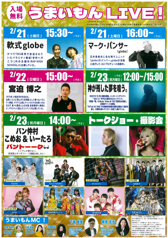 2/23(祝月)12時~/15時: SNSで爆発的な人気を誇るロックバンド「神が残した夢を喰う。」のライブや、バン仲村さん、こめお&いーたろさんによる、ここだけの「バントーーク🕶」も必見です。