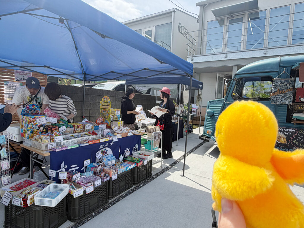 駐車場には、駄菓子屋さんやキッチンカー、手作りの小物屋さんが並び、